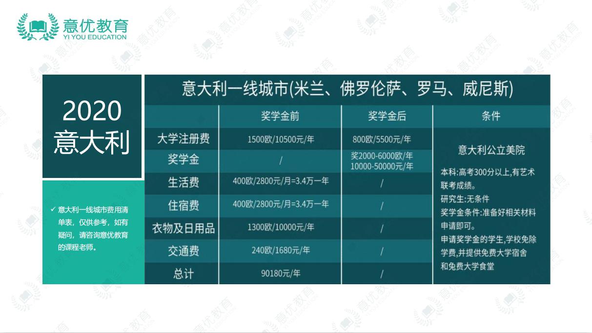 以上總結綜合了大多數(shù)的留學機構數(shù)據(jù)及已經(jīng)在意大利生活的意優(yōu)學生的數(shù)據(jù),數(shù)據(jù)波動的最大值和最小值的重要原因是取決于學生是否申請意大利學院獎學金;所以,意優(yōu)老師建議學生們在決定去意大利留學的時候一定要準備好材料申請獎學金,有了獎學金可以幫助學生減免非常多的費用,以及提供各種學生福利。這里羅列的費用都是學生們在意大利正常的生活開銷,等同于國內(nèi)正常大學生的生活步驟的花銷,所以,意大利留學的費用綜上所述就是這么多了。