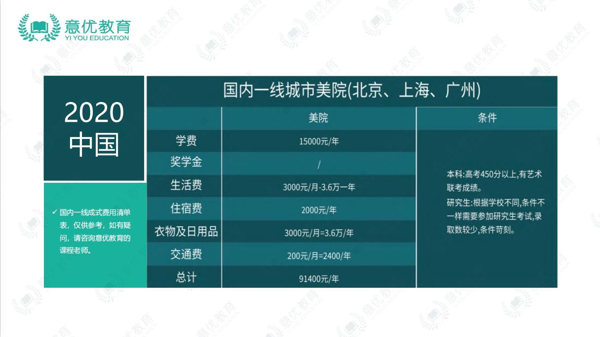 留學辦理費用。留學辦理包括委托留學服務,以及材料費、翻譯和認證費等,具體支出根據(jù)各留學服務機構制定的標準,實際材料支出的費用而不同。國內(nèi)境內(nèi)費用取平均值大概1.2萬人民幣左右。在意優(yōu)學習的學生是免除中介費用(滿足意優(yōu)報名學習條件)。