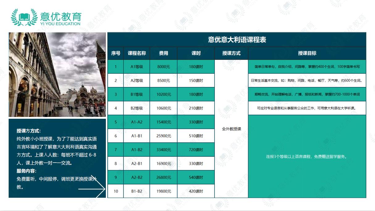 因為了解同學們?nèi)ヒ獯罄麆側(cè)刖秤龅降姆N種的不適應(yīng)問題導(dǎo)致很多事情不好解決,意優(yōu)教育老師全部是意大利留學歸來,對意大利情況非常清楚,我們將陪學生一起去意大利,全程陪同,直至大家在意大利處理完語言學校入學,期間幫大家安排住宿,生活品采購,辦理相關(guān)證件,銀行卡,電話卡等等,確保每一位同學的順利進入意大利學習。